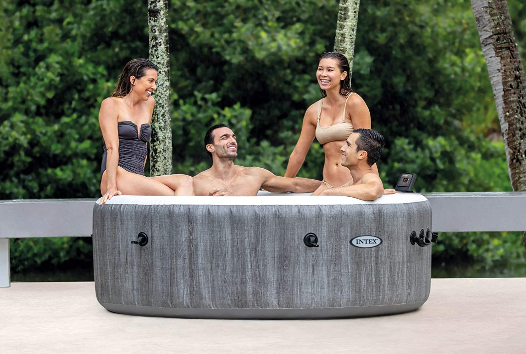 Intex spa 28440 Jacuzzi, Fiber-Tech tm tehnologija za vrhunsku stabilnost i udobnost, hidromasazni, ukupni kapacitet vode 795L, 140 mlaznica, prenosivi, sa filterom i grejacem za temperaturu vode 20 do 40 stepeni, rast teperature 1,5 – 2,5 C na sat Namenjen za 4 osobe, obim 196cm, visina 71cm ,bezicna kontrola upravljanja . Set sadrzi 220-240v pumpu kapaciteta 1741 L/h sa 2 filtera, grejac, termo prekrivac, crevo za punjenje vode, test za vodu,2 premium naslona za glavu,LED svetiljku za vodu, podmetac i torba za nosenje